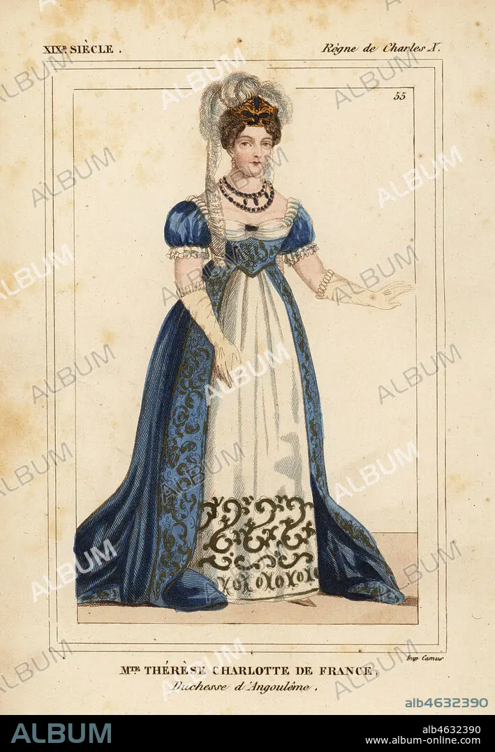 Caption: Marie Therese Charlotte de France, Duchesse d'Angouleme, eldest child of King Louis XVI and Marie Antoinette, 1778-1854. Handcoloured lithograph from Le Bibliophile Jacob aka Paul Lacroix's Costumes Historiques de la France (Historical Costumes of France), Administration de Librairie, Paris, 1852.