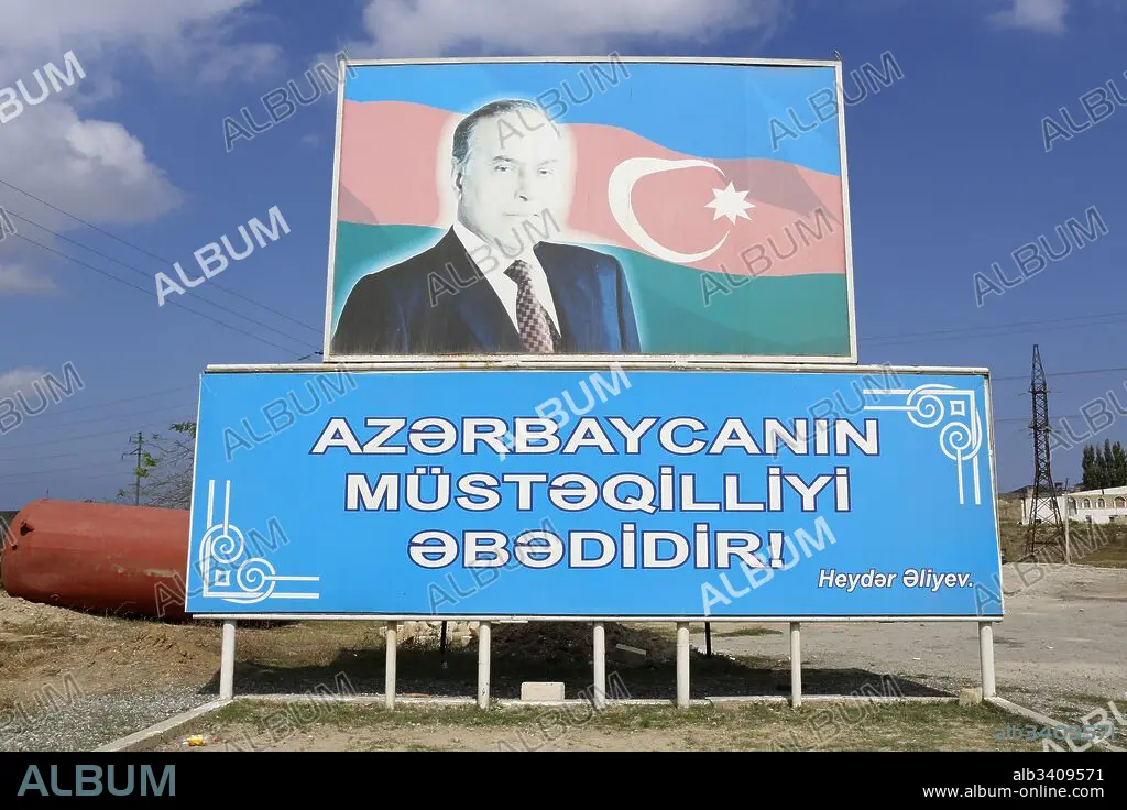 Caption: Heydar Aliyev portrait and slogan Azerbaijans independence is everlasting.