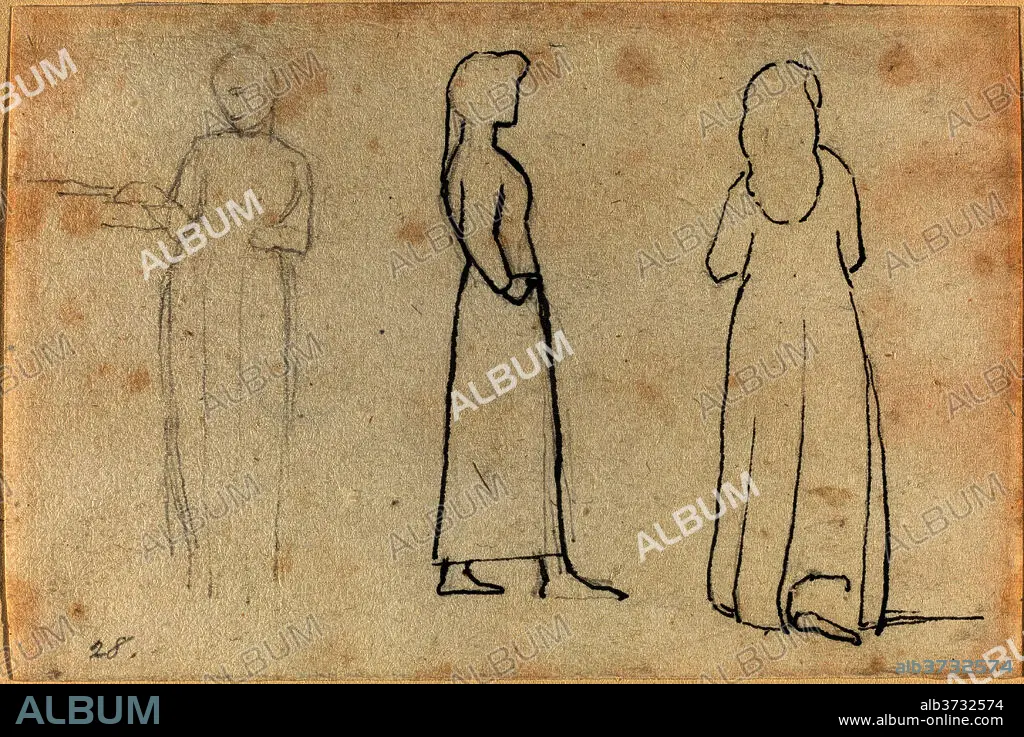 Caption: Three Sketches of a Standing Woman. Dated: c. 1790. Dimensions: overall: 8.8 x 13.1 cm (3 7/16 x 5 3/16 in.). Medium: pen and black ink over graphite on laid paper.