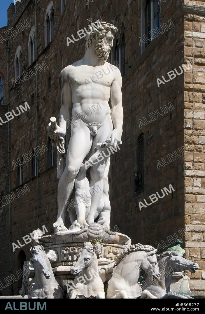 Caption: Italy: A marble statue portraying 'Neptune', the Fountain of Neptune, Piazza della Signoria, Florence. Sculpted by Bartolomeo Ammannati (1511 - 1592), 1565. Neptune is the god of freshwater and the sea in Roman religion. He is the counterpart of the Greek god Poseidon. In the Greek-influenced tradition, Neptune is the brother of Jupiter and Pluto; the brothers preside over the realms of Heaven, the earthly world, and the Underworld. Salacia is his wife.