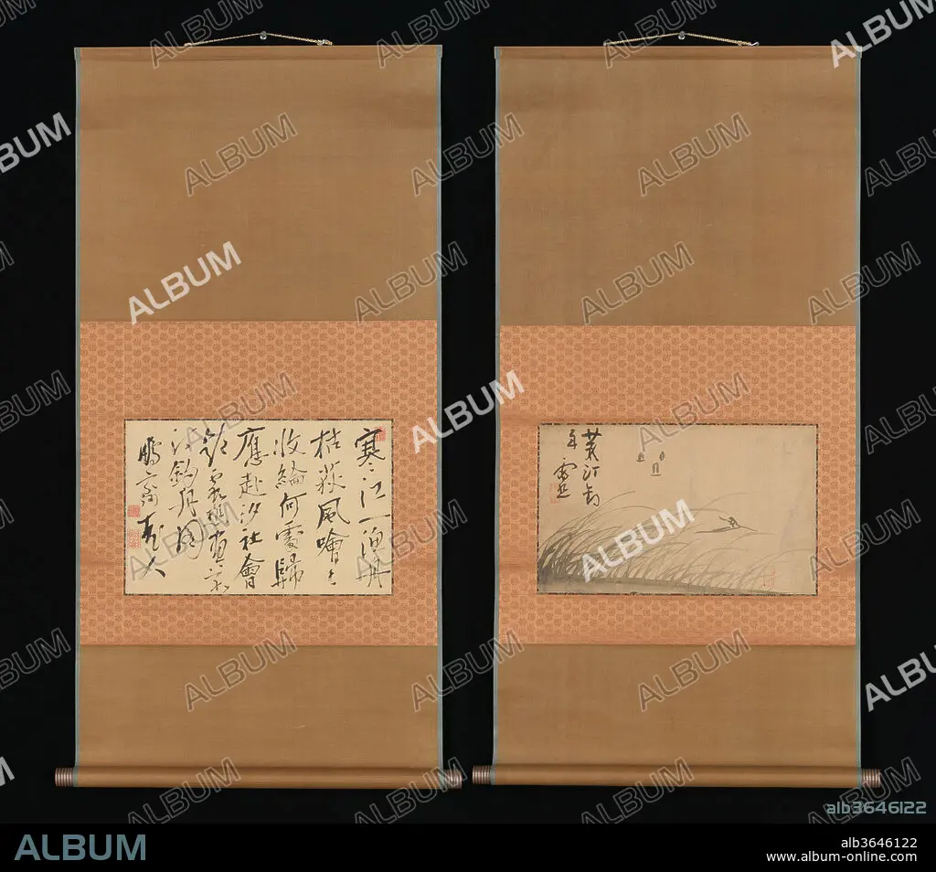 Caption: Fishing Boat on Reed Covered Bank and Calligraphy. Artist: Ike Taiga (Japanese, 1723-1776). Calligrapher: Kameda Bosai (Japanese, 1752-1826). Culture: Japan. Dimensions: Image (a): 8 7/8 × 14 3/4 in. (22.6 × 37.5 cm) Overall with mounting (a): 39 3/8 × 19 1/2 in. (100 × 49.5 cm) Overall with knobs (a): 39 3/8 × 21 1/2 in. (100 × 54.6 cm) Image (b): 9 3/16 × 14 1/2 in. (23.4 × 36.9 cm) Overall with mounting (b): 39 3/8 × 19 9/16 in. (100 × 49.7 cm) Overall with knobs (b): 39 3/8 × 21 7/8 in. (100 × 55.5 cm). Date: 18th-19th century.