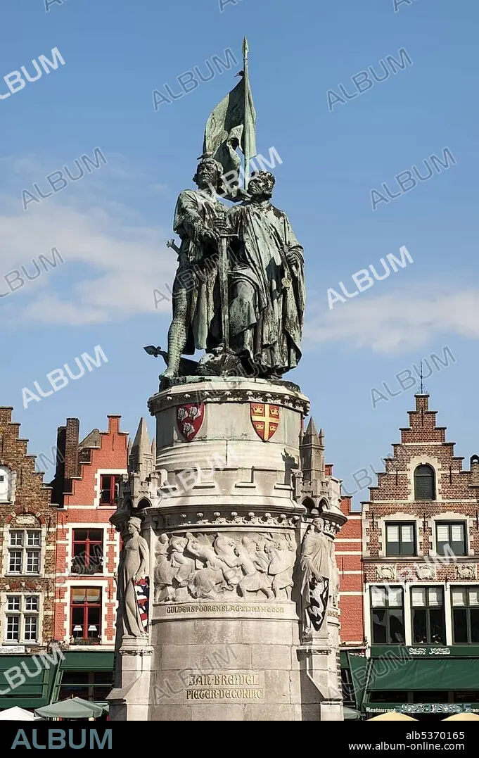 Jan Breydel and Pieter Deconinck statue on market square, historic centre of Bruges, Unesco World Heritage Site, Belgium, Europe.