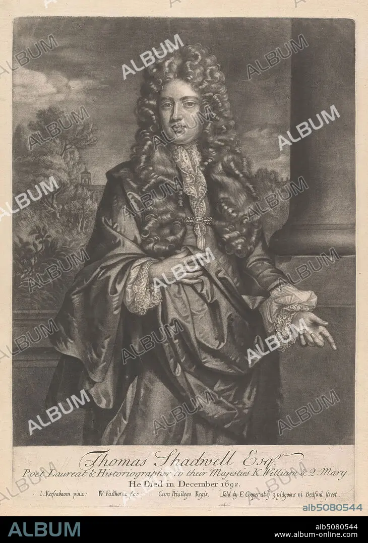 Caption: Thomas Shadwell, Esquire, Poet Laureat & Historiographer, Print made by William Faithorne, 1656ca. 1701, British, after John Kerseboom, op.1680 m. 1708, German, Published by Edward Cooper, active 1682 died 1725, British, between 1690 and 1703, Mezzotint on moderately thick, slightly textured, beige laid paper, Sheet: 15 13/16 x 11 1/8 inches (40.1 x 28.2 cm), Plate: 13 7/8 x 9 3/4 inches (35.2 x 24.7 cm), and Image: 12 1/16 x 9 3/4 inches (30.7 x 24.7 cm), broche, building, clouds, columns, cravat, cuffs, curls, gesturing, historian, lace, man, nobleman, pin, playwright, poet, pointing, portrait, robes, sash, satin, trees, wig
