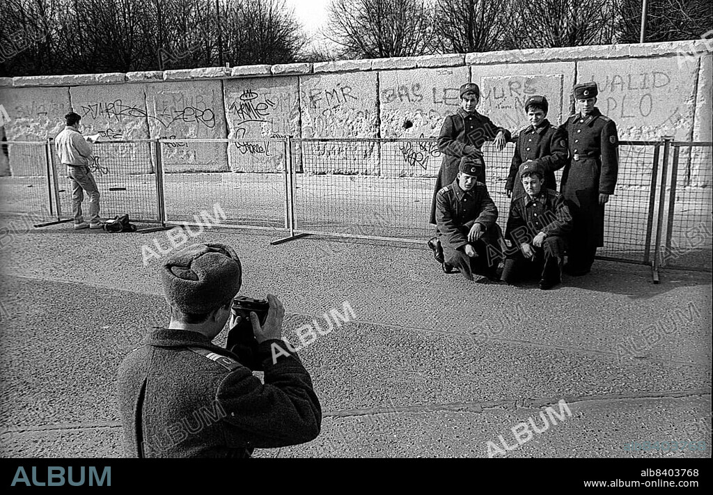 GDR, Berlin, 23. 02. 1990, Soviet (Russian) soldiers taking photos of themselves at the Wall at the Brandenburg Gate.