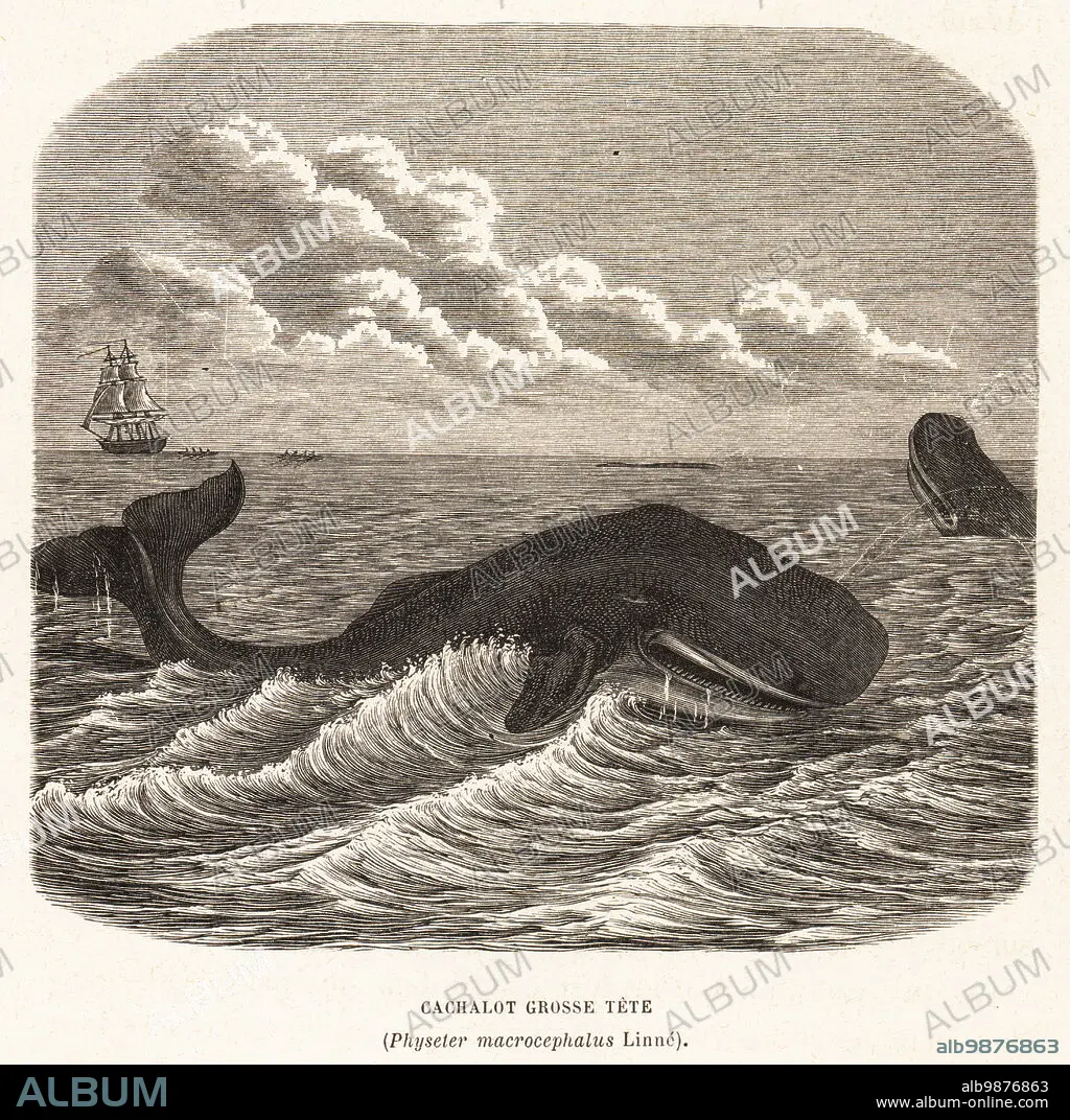 Caption: Sperm whale or cachalot, Physeter macrocephalus. A whaler hunting in the distance. Cachalot grosse tete. Woodcut from Alfred Fredols Le Monde de la Mer, the World of the Sea, edited by Olivier Fredol, Librairie Hachette et. Cie., Paris, 1881. Alfred Fredol was the pseudonym of French zoologist and botanist Alfred Moquin-Tandon, 1804-1863.