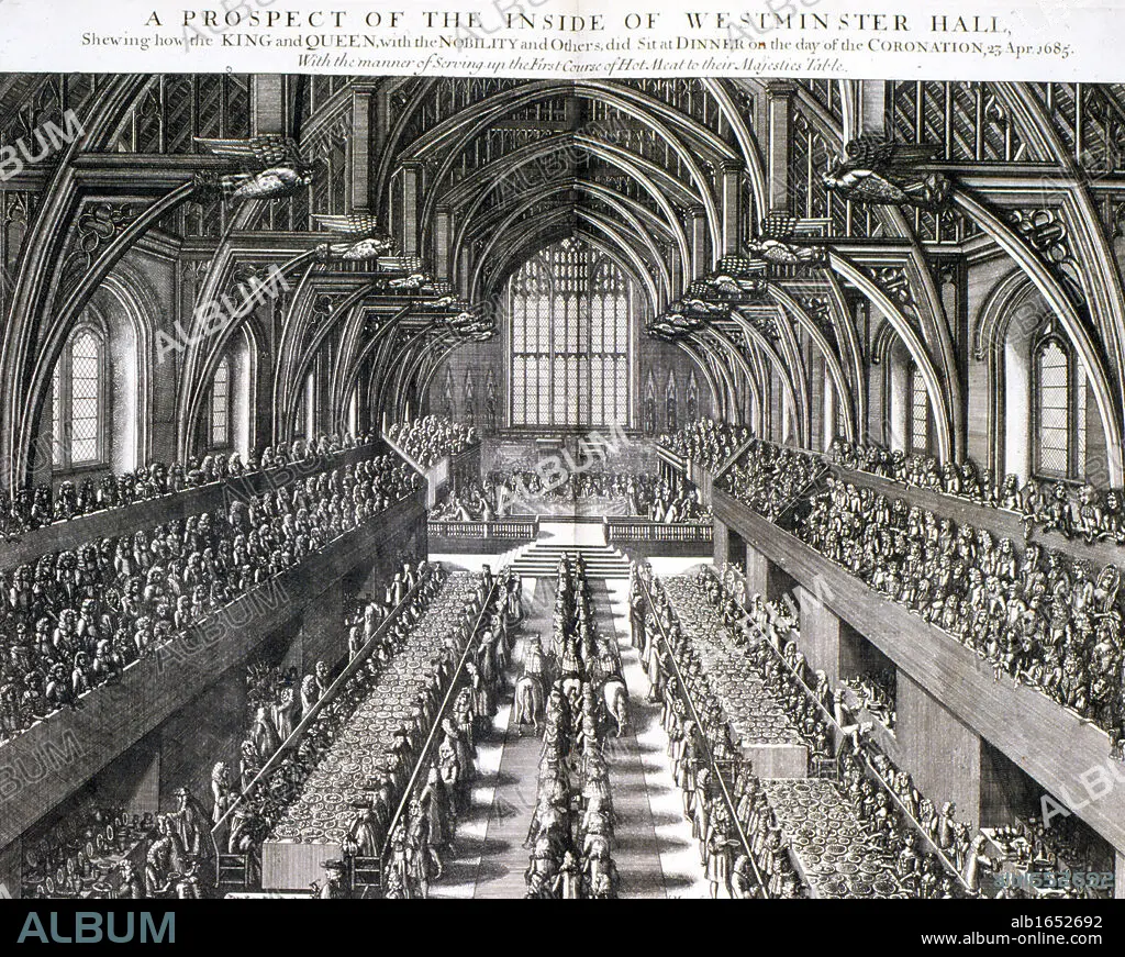 Caption: James II of England VII of Scotland (1633-1701). Reigned 1685-1688. Coronation of James II and his queen Mary (of Modena), 1685. Scene in the Banqueting Hall, Whitehall, London, celebrating the coronation. Engraving.