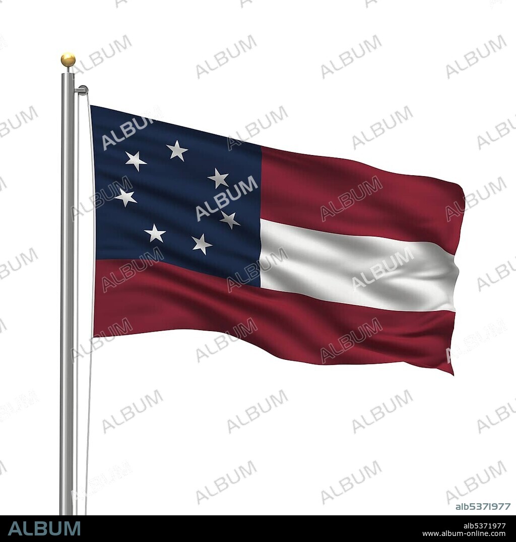 First official flag of the Confederate States of America, called the "Stars and Bars", with seven stars waving in the wind