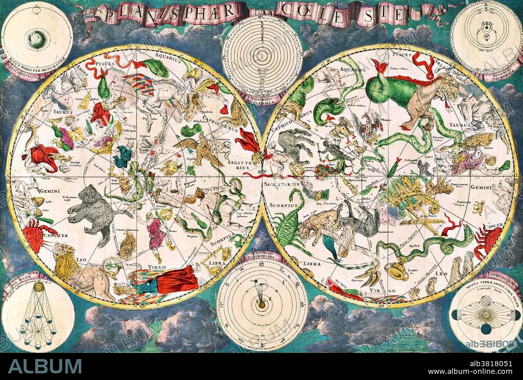 Caption: Planisphaeri coeleste, 1680, a celestial planisphere featuring the constellations of the northern and southern hemispheres with traditional representations of the signs of the Zodiac and constellations, including Draco, Serpens and Hydra. Astronomy and celestial star chart map by the Dutch cartographer family Frederik de Wit. A star chart or star map is a map of the night sky. Astronomers divide these into grids to use them more easily. They are used to identify and locate astronomical objects such as stars, constellations and galaxies. They have been used for human navigation since time immemorial. A planisphere is a type of star chart. The Atlas Coelestis is a star atlas published posthumously in 1729, based on observations made by the First Astronomer Royal, John Flamsteed.