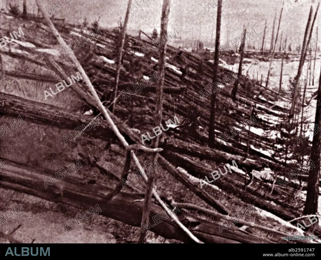 Caption: Photograph of fallen trees after the Tunguska event. The Tunguska event was a large explosion, which occurred near the Podkamennaya Tunguska River in what is now Krasnoyarsk Krai, Russia. Dated 1908
