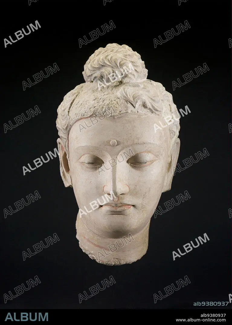 Caption: Head of a Buddha, Gandhran, probably Kidarite dynasty, 3rd5th century, 4th century, Stucco with traces of pigment, Hadda, Punjab province, Pakistan, Asia, Sculpture, stone & mineral, 18 x 11 1/2 x 10 1/2 in. (45.7 x 29.2 x 26.7 cm)