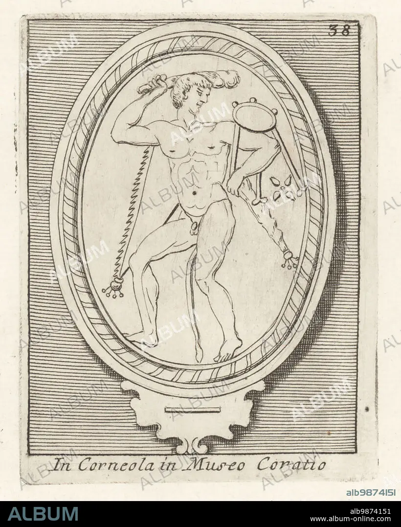 Greek hero Heracles taking the Delphic tripod. He holds his club above his head and wears the Nemean lionskin. From an engraved cornelian gem. Hercules Tripodem Auferens in Corneola in Museo Coratio. Copperplate engraving from Francesco Valesio, Antonio Gori and Ridolfino Venutis Academia Etrusca, Museum Cortonense in quo Vetera Monumenta, (Etruscan Academy or Museum of Cortona), Faustus Amideus, Rome, 1750.