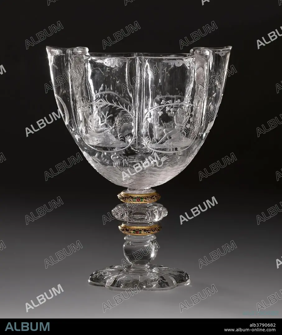 Caption: Workshop of the Sarachi; Annibale Fontana (Designer) (?) / 'Cup with the Four Seasons'. 1570 - 1600. Rock crystal / Hyaline quartz, Enamel, Gold