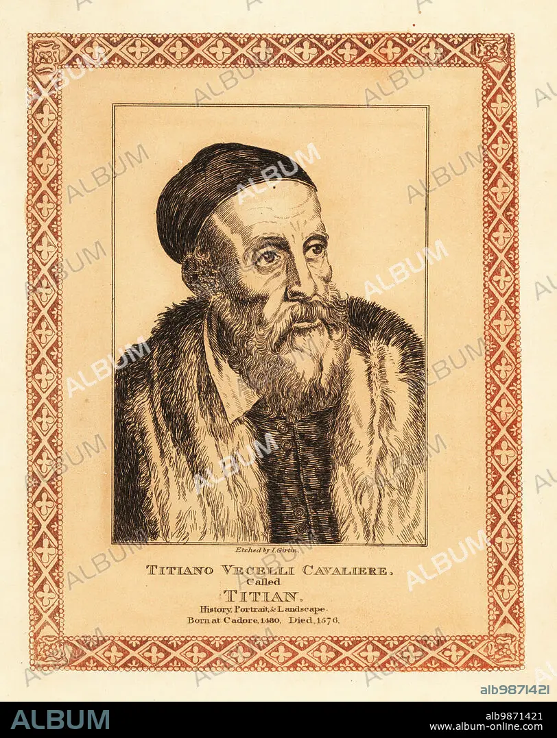 Caption: Tiziano Vecellio, c.1480-1576, Italian Renaissance painter of the Venetian school. Titian, Titiano Vecelli Cavaliere, history, portrait and landscape painter.. Tinted etching within a decorative border by John Girtin after a self-portrait by Titian from John Girtins Seventy-Five Portraits of Celebrated Painters from Authentic Originals, J. MCreery, London, 1817.