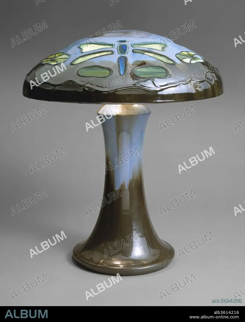 The Fulper Pottery was one of the most prolific, successful, and long-lasting art potteries in America. Fulper had operated in Flemington, New Jersey, producing utilitarian stoneware since the early nineteenth century. It was not until 1909 that the firm developed an artistic line, called "Vasekraft," under the direction of William Hill Fulper II (1872-1928), in whose family the lamp descended. The majority of its production was simple solid oriental shapes with brilliantly colored glazes. Fulper lamps-with glazed pottery shades inset with colored glass-were truly innovative forms. The firm's most spectacular and innovative accomplishments are the table lamps made with glazed pottery bases and shades, which were inset with pieces of colored opalescent glass. This ambitious example, one of only two known of this design, features a shade in the most complex pattern made by the factory. The glass-filled openings delineate dragonflies and water lilies, motifs favored at the same time by noted glass artist Louis Comfort Tiffany. Evoking the natural watery environment of the insects and plants, the lamp is sheathed in a rich Chinese blue flambé glaze.