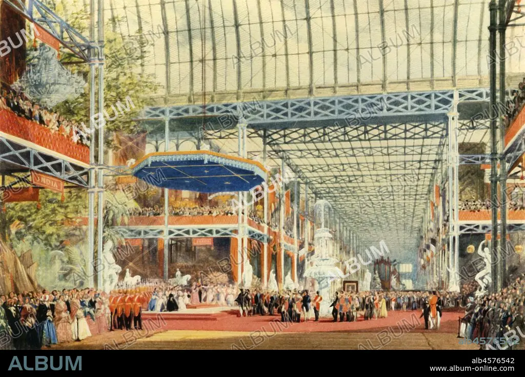Caption: 'The Opening of the Great Exhibition by Queen Victoria on May 1st, 1851', (1942). Queen Victoria (1819-1901) opening the Great Exhibition in the purpose-built Crystal Palace in London's Hyde Park. Conceived by her husband Prince Albert, the exhibition was intended to showcase the 'Works of the Industry of all Nations'. The Crystal Palace was the first large-scale prefabricated ferrovitreous (iron and glass) structure, and was designed by the landscape designer, Joseph Paxton. The prefabricated design made the construction, and later dismantling of the building, easier and quicker. There were over six million admissions counted at the toll-gates - the exhibition remained open until 15 October. The entire glass building was then dismantled and re-erected in Sydenham, south London. From "Life Among the English", by Rose Macaulay. [Collins, London, 1942]