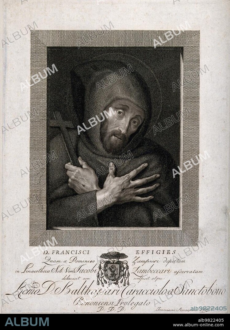Caption: Saint Francis of Assisi; Giovanni di Pietro di Bernardone; 1181 or 1182 to 3 October 1226; the founder of the Order of Friars Minor; Ordo fratrum minorum; Franciscans; Saint Francis of Assisi holding a cross; weeping; c. 1700; Historic; digitally restored reproduction from a 19th century original