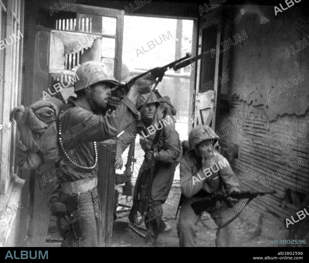 Captioned: "United Nations troops fighting in the streets of Seoul, Korea (The Second Battle of Seoul was the battle to recapture Seoul from the North Koreans in late September 1950)." On June 25, 1950, the Korean War began when soldiers from the North Korean People's Army crossed the 38th parallel, the boundary between the Soviet-backed Democratic People's Republic of Korea to the north and the pro-Western Republic of Korea to the south. This invasion was the first military action of the Cold War. By July, American troops had entered the war on South Korea's behalf. After some early back-and-forth across the 38th parallel, the fighting stalled and casualties mounted with nothing to show for them. Meanwhile, American officials worked to fashion some sort of armistice with the North Koreans. The alternative, they feared, would be a wider war with Russia and China. In July 1953, the Korean War came to an end. 5 million soldiers and civilians lost their lives during the war. The Korean peninsula is still divided today. Photograph credited to Lt. Robert L. Strickland and Cpl. John Romanowski, U.S. Army, September 20, 1950.