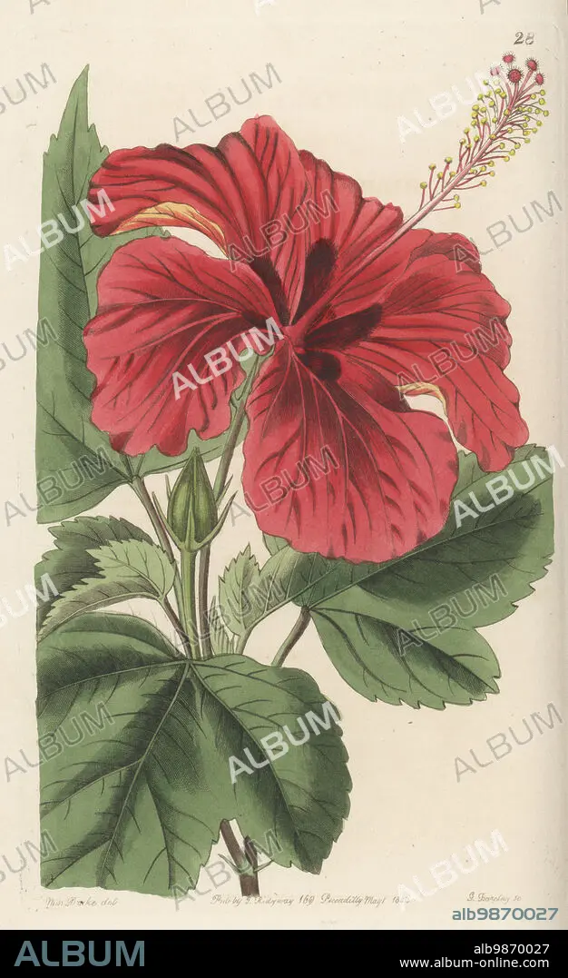 Caption: Hybrid rose mallow. Hibiscus cameroni-fulgens, garden variety. Hybrid of Hibiscus cameronii and Hibiscus fulgens (Hibiscus rosa-sinensis), raised by nurseryman William Rollisson of Tooting. Handcoloured copperplate engraving by George Barclay after a botanical illustration by Sarah Drake from Edwards Botanical Register, continued by John Lindley, published by James Ridgway, London, 1844.