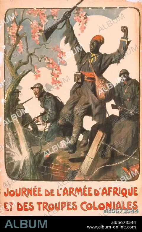 History / World War I / Propaganda. "Journée de l'armée d'Afrique et des troupes coloniales" (African colonial troops within the French army at the front in France). Poster, France, 1917. Col. lithograph, 120 × 80cm. Design: Lucien Jonas (1880-1947). Print: Devambez, Paris.