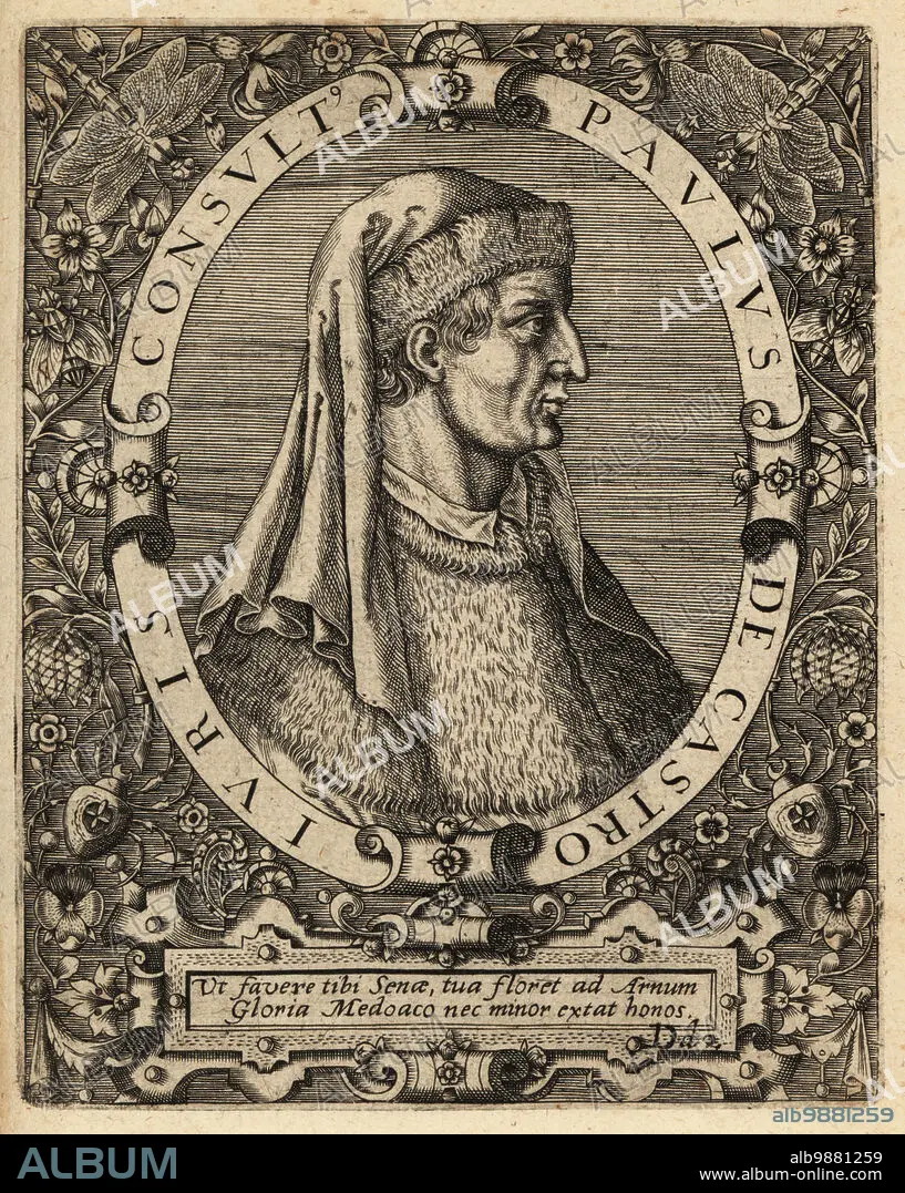 Paulus Castrensis, Pauli di Castro, or Paolo Castrense, 1360-1441, Italian jurist, studied under Baldus de Ubaldis. Paulus de Castro Iuris Consult. Copperplate engraving by Johann Theodore de Bry from Jean-Jacques Boissards Bibliotheca Chalcographica, Johann Ammonius, Frankfurt, 1650.