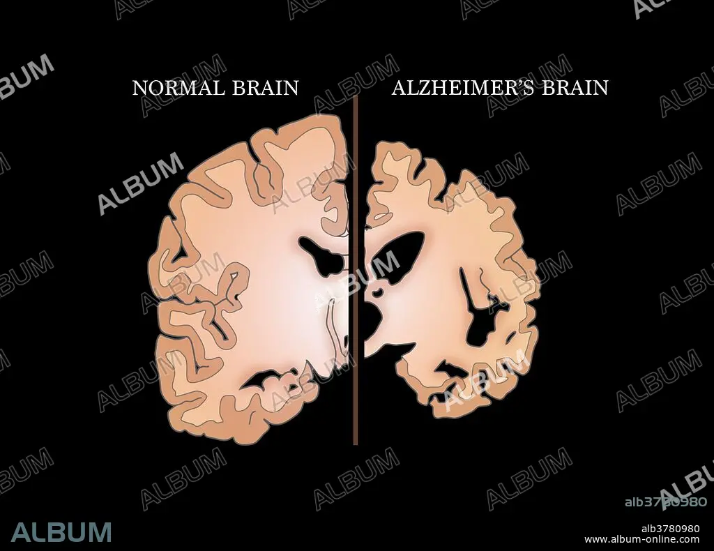 Caption: Illustration comparing a normal brain (left) with a brain suffering from Alzheimer's disease (right).