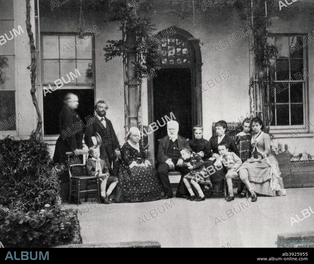 Victor Hugo, French novelist, in exile in Guernsey, 1866. Victor Hugo with, amongst others, Juliette Drouet, and his grandchildren Georges and Jeanne Hugo. Hugo was a central figure in the French Romantic movement. In 1848, the year of revolutions in Europe, he was elected to the Assembly as a Republican but after Napoleon III's coup d'etat he was sent into exile, living in Guernsey in the Channel Islands until 1870. An actress, Juliette Drouet was his mistress. A photograph from Album de Photographies dans L'Intimite de Personnages Illustres, 1855-1915, 8th album, Editions MD, Paris.