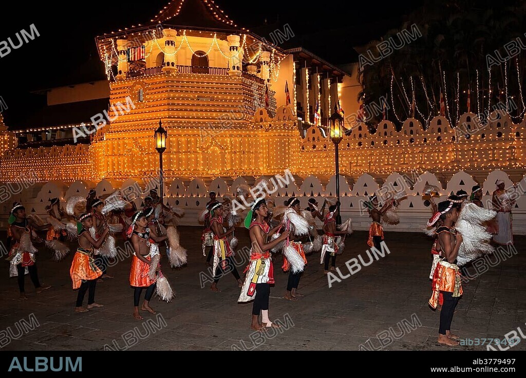 Caption: Dance troupe, Kandy Dancers in traditional costumes, Esala Perahera Buddhist festival, Sri Dalada Maligawa or Temple of the Sacred Tooth Relic, Kandy, Central Province, Sri Lanka, Asia