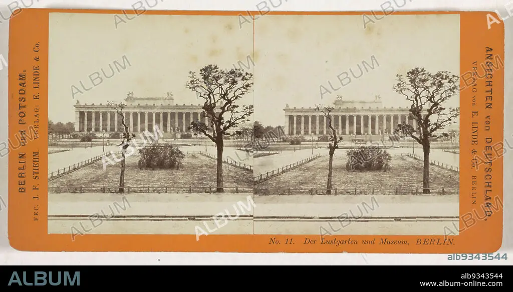 View of the Altesmuseum from the Lustgarten, Berlin, Der Lustgarten und Museum. Berlin (title on object), Ansichten von Deutschland, Berlin und Potsdam (series title on object), Johann Friedrich Stiehm (mentioned on object), publisher: E. Linde & Co (mentioned on object), Lustgarten, publisher: Berlin, 1868 - 1870, cardboard, paper, albumen print, height 86 mm × width 176 mm