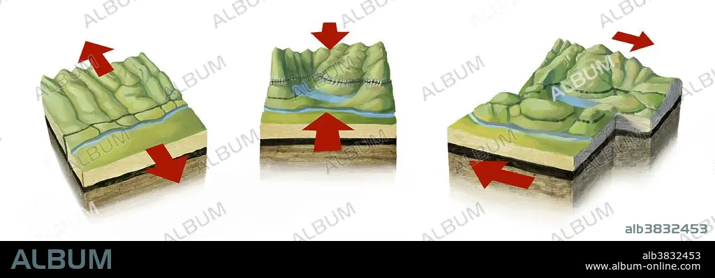 Caption: Illustration representing the four different types of earthquake faults. Each is differentiated by the relative position of the fault plane. A normal fault (at left) which occur where the crust is being pulled apart. A reverse fault (middle) forms where a plate is being compressed. A thrust fault (also middle) moves the same way as a reverse fault, but at an angle of 45 degrees or less. A dip slip faults (at right) which forms when crust pieces slide along each.
