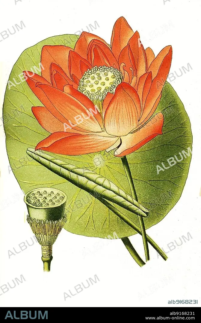 Nelumbium speciosum, Indian lotus, Lotus, digital, restored reproduction of a 19th century original.