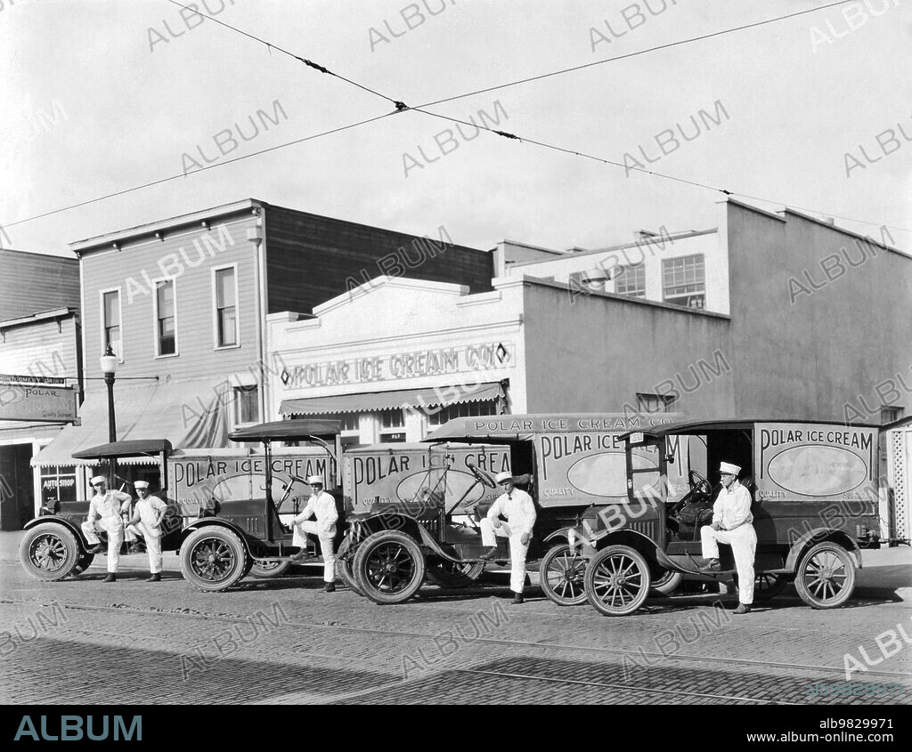 Austin, Texas circa 1914, The exterior of the Polar Ice Cream Company along with its drivers and delivery trucks.