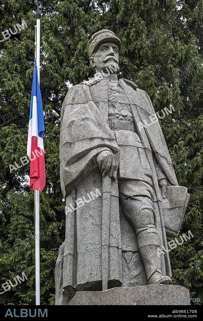 Caption: Statue of general Ferdinand Foch, Allied Generalissimo during the First World War, at the Glade of the Armistice, Clairière de l'Armistice, WWI memorial in the Forest of Compiègne, France, Europe