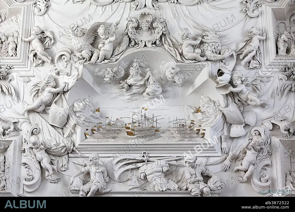 Baroque stucco relief "Battle of Lepanto" by Giacomo Serpotta, Oratorio del Rosario di Santa Cita, Palermo, Sicily, Italy