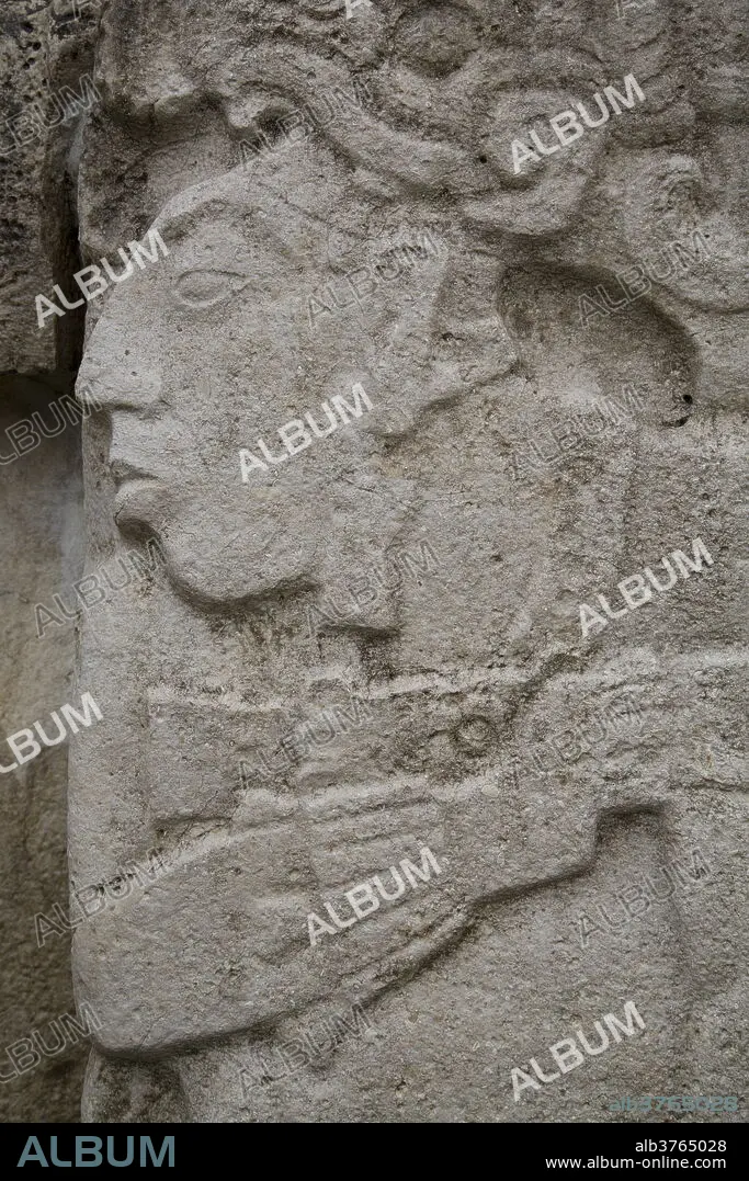 Caption: Stone carving of Pacal the Great, Palenque ruler from 615 AD to 683 AD, Palace, Palenque Archaeological Zone, UNESCO World Heritage Site, Chiapas, Mexico, North America