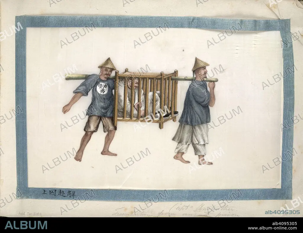 Captain Anstruther. Album containing 12 paintings illustrating Chinese. 1840 - 1860. Capt. Anstruther. Transporting from and to prison'. In a wooden cage. Capt. Philip Anstruther (1807-84) was in charge of a detachment of Madras Artillery in the Anglo-Chinese war of 1840-41. He was captured by the Chinese on 15th September 1840, and transported about the country in a wooden cage. Gouache on pith paper. China/Canton style. Image taken from Album containing 12 paintings illustrating Chinese punishments. Hastings Albums. Originally published/produced in 1840 - 1860. . Source: Add.Or.5189,. Language: Chinese and English.