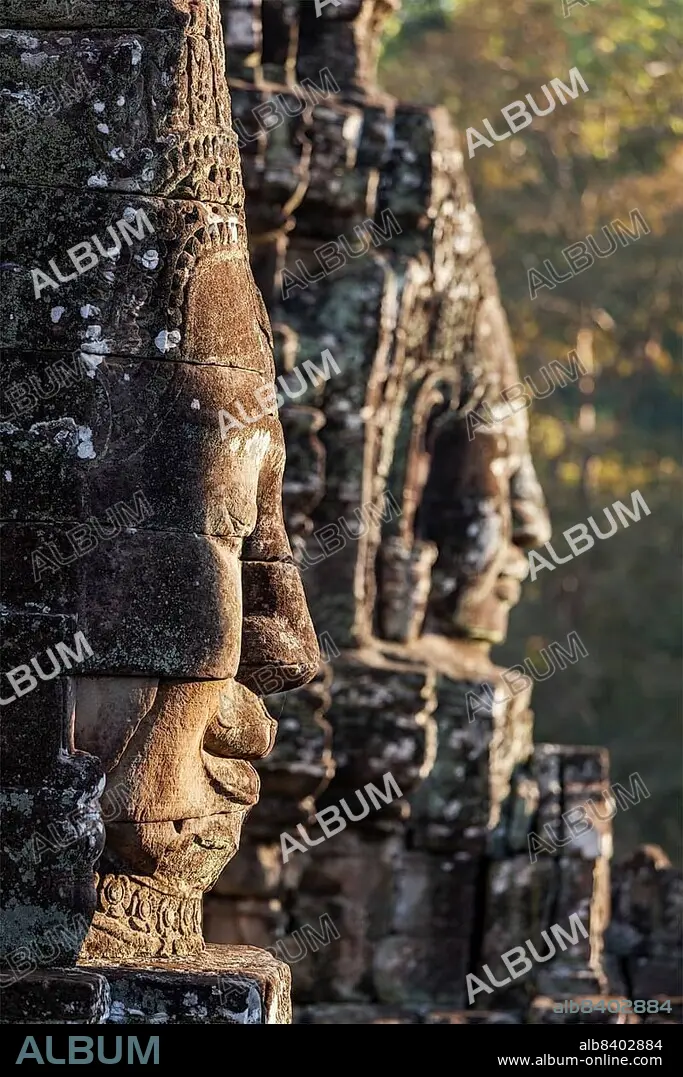Ancient stone faces of Bayon temple, Angkor, Cambodia on sunset