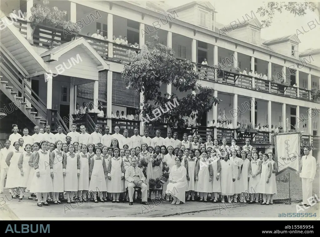 Caption: s Lands Hospitaal, Paramaribo, Suriname, Group photo from photo album of hospital staff in front of the building of 's Lands Hospitaal in Paramaribo, Suriname. On the right a man with a banner with the name of the hospital. Part of Theodoor Brouwers' photo album about Suriname around 1930., photograph, anonymous, Paramaribo, 1934 - 1935, paper, gelatin silver print, height, 116 mm × width, 167 mm, height, 148 mm × width, 200 mm