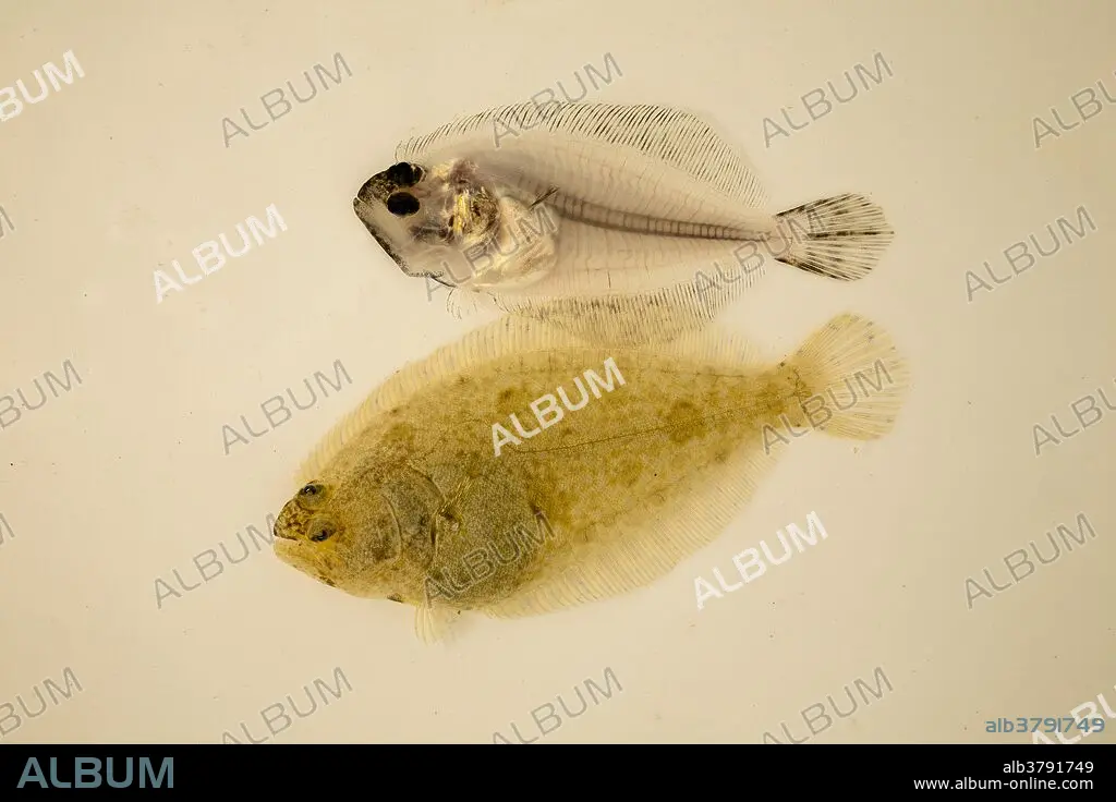 Caption: Southern Flounder, Paralichthys lethostigma, transilluminated by light from below, two juveniles photographed in laboratory of University of Texas Marine Science Institute (UTMSI), Port Aransas, Texas. These are juveniles, not larval fish (the larvae have metamorphosed). The smaller, lighter one is a 70-day-old albino, and is 35mm long. The larger, normally pigmented one, 90 days old and 43mm long, has a bulging stomach containing the remains of cohorts it has cannibalized, from within a crowded tank. Captured from Aransas Bay and studied by Dr. G. Joan Holt, marine biologist at UTMSI.