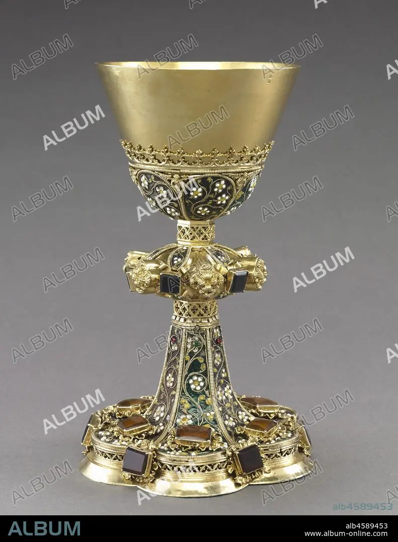 Caption: Chalice, c. 1450-1480. The chalice and paten?the most important liturgical vessels?are used at the altar by the priest for the consecration of the Eucharistic bread and wine during the celebration of the mass. This chalice survives with its original paten. The form of the chalice evolved over the centuries. Gothic chalices, like this one, gradually developed angular or faceted knops, generally hexagonal, with lobed feet. This sublime example is decorated with filigree enamel consisting of twisted gold wire forming a floral design, which in turn is filled with colourful glass pastes. Gemstones add to the embellishment.