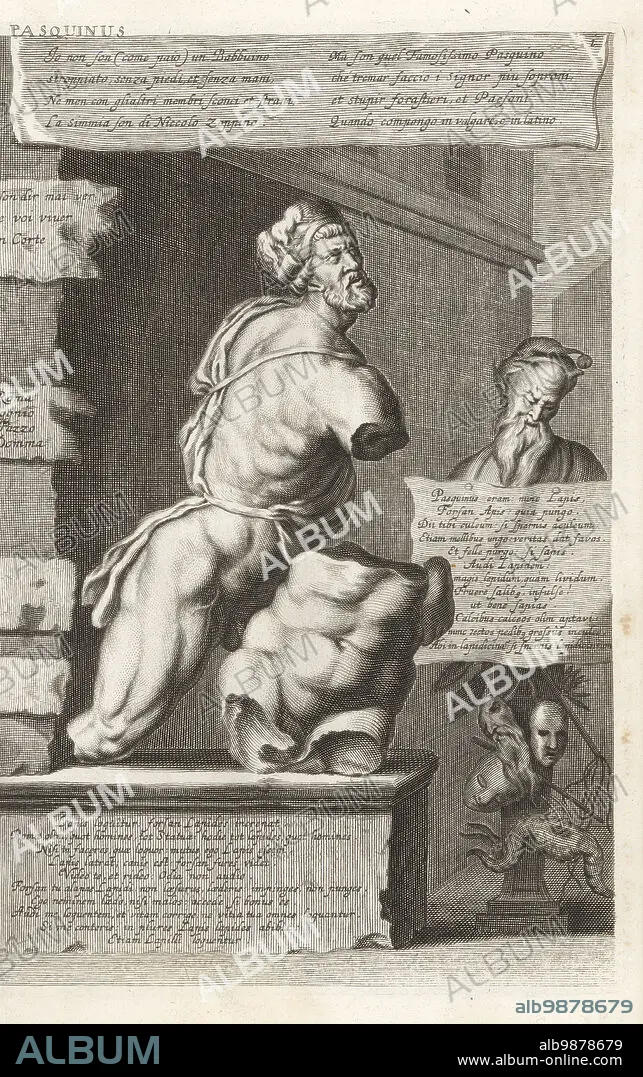 Pasquino or Pasquin, an antique Hellenistic statue of Menelaus supporting the body of Patroclus rediscovered in the Palazzo Braschi, Rome, in the 15th century. A talking statue with many cartellini, or satirical verses in Italian and Latin, and drama masks and hats. Copperplate engraving after an illustration by Joachim von Sandrart from his LAcademia Todesca, della Architectura, Scultura & Pittura, oder Teutsche Academie, der Edlen Bau- Bild- und Mahlerey-Kunste, German Academy of Architecture, Sculpture and Painting, Jacob von Sandrart, Nuremberg, 1675.