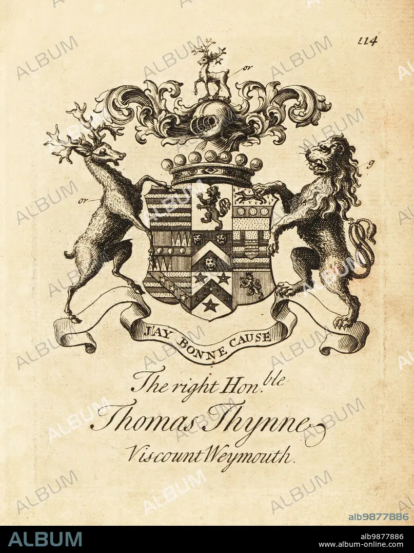Caption: Coat of arms of the Right Honourable Thomas Thynne, 2nd Viscount Weymouth, (1710-1751) of Longleat House. Copperplate engraving by Andrew Johnston after C. Gardiner from Notitia Anglicana, Shewing the Achievements of all the English Nobility, Andrew Johnson, the Strand, London, 1724.