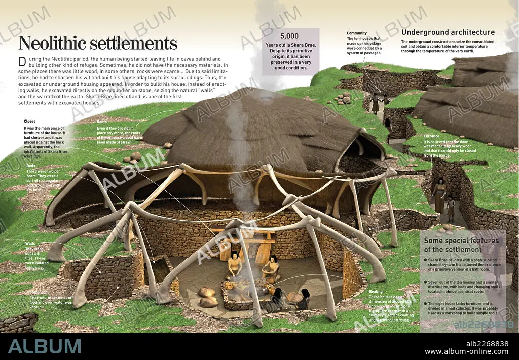 Caption: Infographic about the Skara Brae, one of the Neolithic settlements, 3000 BC-2500 BC, underground housing where mankind survived after living in the caverns or caves.