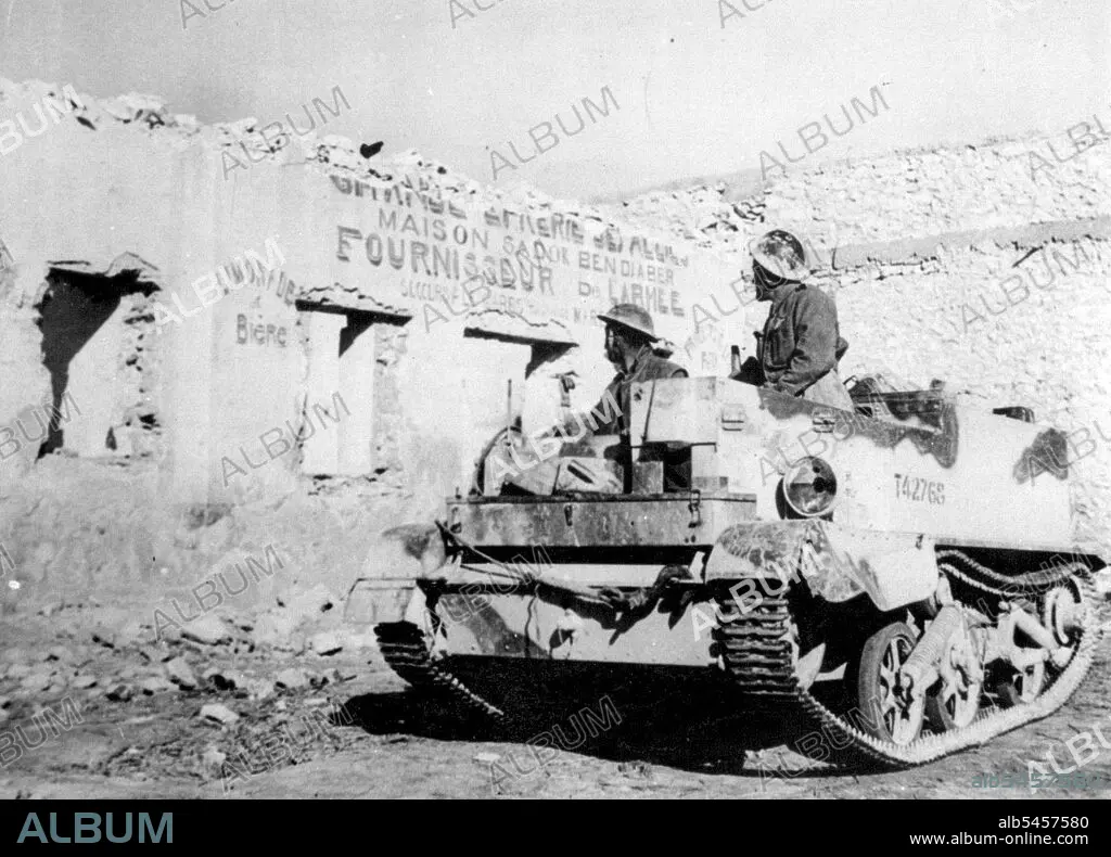 Caption: Scars Of Mareth Line Fighting -- In a Desert-Worn tank, British Tommies who played roles in the Victory of the Mareth line look over damage done by the fighting to one of the few shops at Mereth. April 14, 1943. (Photo by Associated Press Photo).