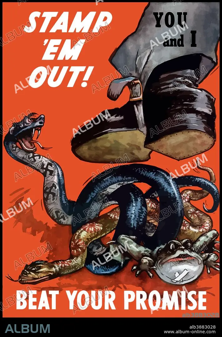 Caption: Digitally restored war propaganda poster. This vintage World War II poster features a boot labeled You and I stamping down on two snakes and a bullfrog representing Germany and Japan. It declares - Stamp 'Em Out! Beat Your Promise.