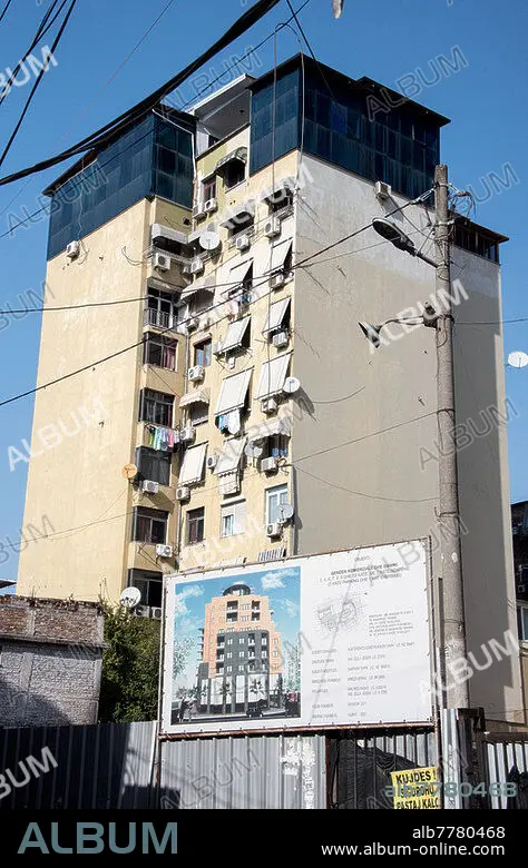 Caption: Albania, October 19, 2018, Tirana, construction sign for a major new construction project on Skanderbeg Square.