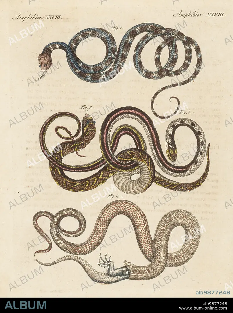 Common lancehead, Bothrops atrox 1, buff striped keelback, Amphiesma stolatum 2, Amazon false fer-de-lance, Xenodon severus 3, and three-scaled groundsnake, Liophis triscalis, swallowing a lizard 4. Copied from Johann Matthäus Bechstein's Naturgeschichte der Ampibien, 1802. Handcoloured copperplate engraving from Carl Bertuch's Bilderbuch fur Kinder (Picture Book for Children), Weimar, 1810. A 12-volume encyclopedia for children illustrated with almost 1,200 engraved plates on natural history, science, costume, mythology, etc., published from 1790-1830.