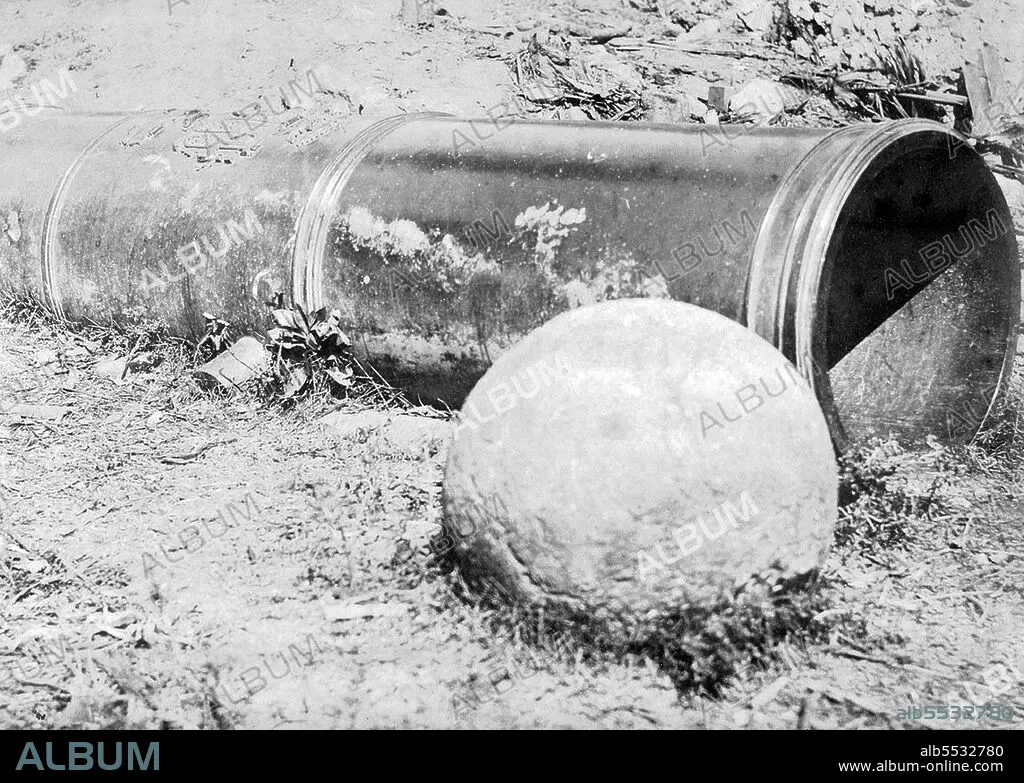 Title: Indonesia / Sumatra: Canon and stone canon ball captured at Banda Aceh by the Dutch,1874. Aceh War (1873-1914)