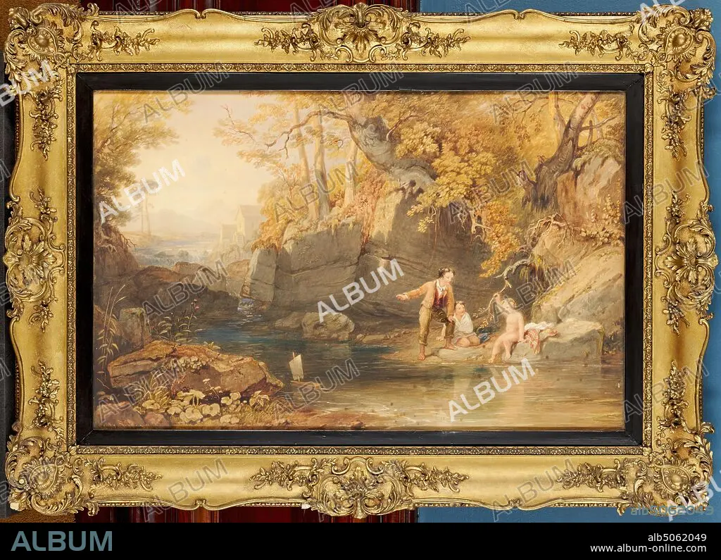 Caption: The Little Boat Adrift, 1820-76 Henry Gastineau (d.1876), Boat, Watercolour, Paper, Frame, Rocks, Nude, Child, Literature, Play, River, Nature, Young, Works on Paper