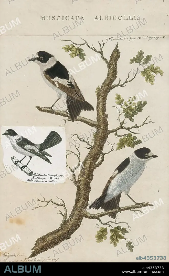 Caption: Muscicapa collaris, Print, Muscicapa is a genus of passerine birds belonging to the Old World flycatcher family Muscicapidae, and therein to the typical flycatchers of subfamily Muscicapinae. They are widespread across Europe, Africa and Asia with most species occurring in forest and woodland habitats. Several species are migratory, moving south from Europe and northern Asia for the winter., 1770-1829