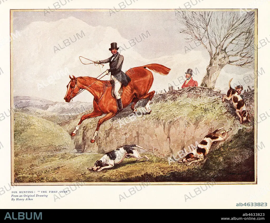 Fox hunting: The first over. Fox hunter in black jacket on horseback jumping first over a fence, while fox hounds run alongside, 1837. Color print after a drawing by Henry Alken in Ralph Nevills Old Sporting Prints, The Connoisseur Magazine, London, 1908.
